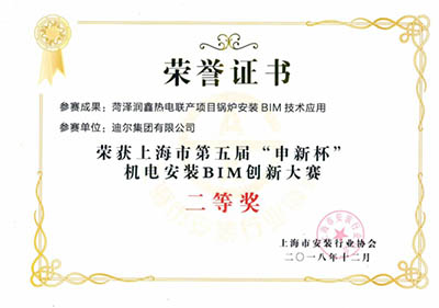 2018年12月,上海市第五屆“申新杯”BIM機電安裝BIM創(chuàng)新大賽結(jié)果出爐,迪爾集團有限公司參賽作品《菏澤潤鑫熱電聯(lián)產(chǎn)項目鍋爐安裝BIM技術(shù)應(yīng)用》斬獲BIM創(chuàng)新大賽二等獎。