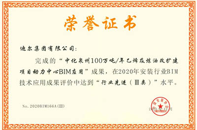 迪爾集團(tuán)有限公司選送的《中化泉州100萬噸/年乙烯及煉油改擴(kuò)建項目動力中心BIM應(yīng)用》成果,獲得2020年安裝行業(yè)BIM技術(shù)應(yīng)用行業(yè)先進(jìn)(Ⅲ類)。