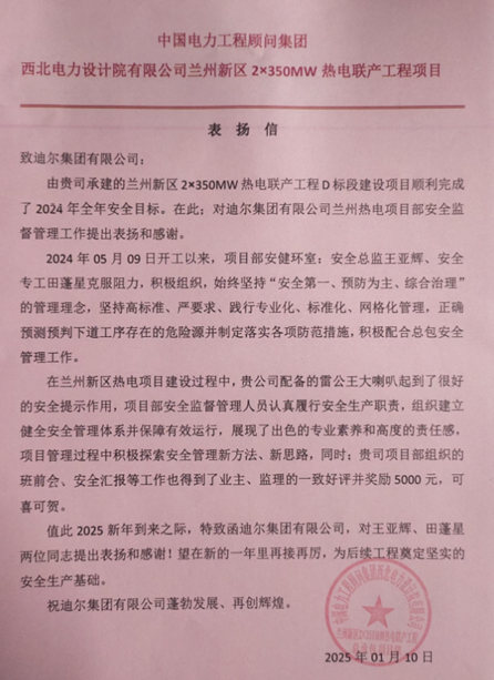 自2024年5月9日開(kāi)工以來(lái),迪爾集團(tuán)第三公司蘭州新區(qū)2×350MW熱電聯(lián)產(chǎn)項(xiàng)目部始終堅(jiān)持“安全第一、質(zhì)量至上”的工作方針,堅(jiān)持高標(biāo)準(zhǔn)、嚴(yán)要求、專(zhuān)業(yè)化、標(biāo)準(zhǔn)化、網(wǎng)格化管理,積極配合總包安全管理工作,圓滿(mǎn)完成2024年度總體安全目標(biāo)。