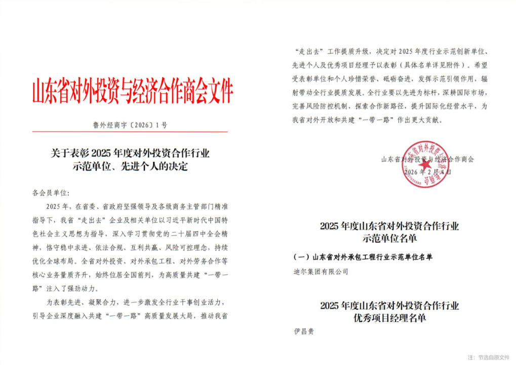 近日,迪爾集團(tuán)榮獲山東省對(duì)外投資與經(jīng)濟(jì)合作商會(huì)授予的“2025年度山東省對(duì)外投資合作行業(yè)示范單位”稱號(hào)。與此同時(shí),集團(tuán)國(guó)際戰(zhàn)區(qū)伊昌貴同志獲評(píng)“2025年度山東省對(duì)外投資合作行業(yè)優(yōu)秀項(xiàng)目經(jīng)理”稱號(hào)。